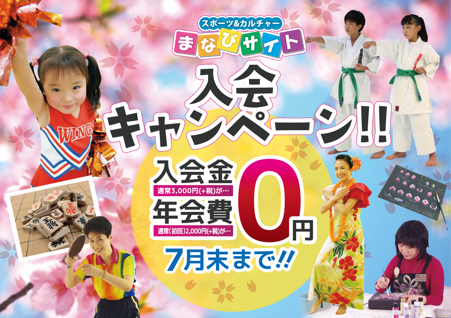 只今7月末まで、まなびサイト及びまなびサイト姉妹店では「入会キャンペーン」を実施いたします。期間内にご入会された方は、「入会金(通常3,000円+税)」「初回年会費(通常2,000円+税)」が無料になります!もちろん、ご入会をご検討頂く為に、無料体験の予約も随時受け付けております。 オンラインレッスンもございますので、レッスンによってはご自宅でも無料体験が可能です。詳しくはまなびサイト各店へお問合せください。