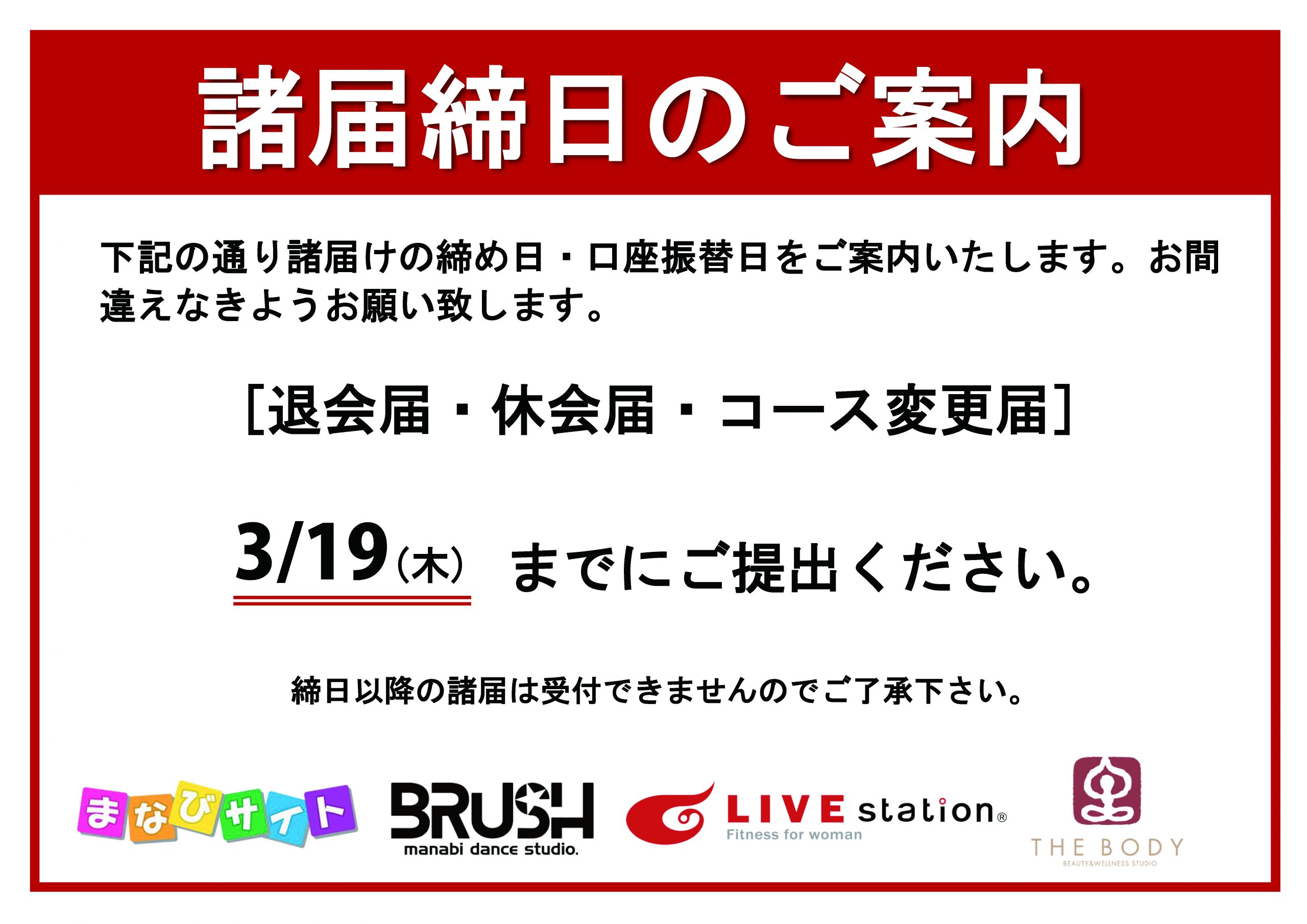 いつもまなびサイトをご利用いただき誠にありがとうございます。 金融機関の手続きの都合上、下記の通り諸届けの締め日を変更させていただきます。 【退会届・休会届・コース変更届】 ■対象:まなびサイト福井全店・まなびサイト金沢入江店 ■ご提出締切日: ◉3月度:3/19(木)まで